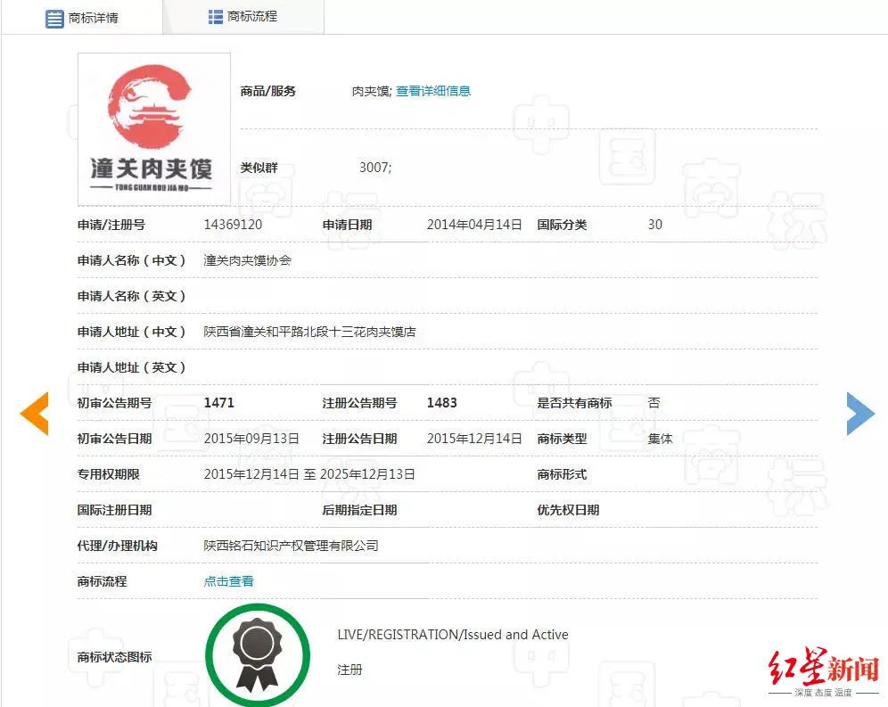 红星新闻记者还从中国商标网了解到,该协会的前身系“老潼关小吃协会”,而“潼关肉夹馍”商标,则是“老潼关小吃协会”于2014年4月14日注册申请的地理标志集体商标,注册公告日期为2015年12月14日,有效期到2025年12月13日。