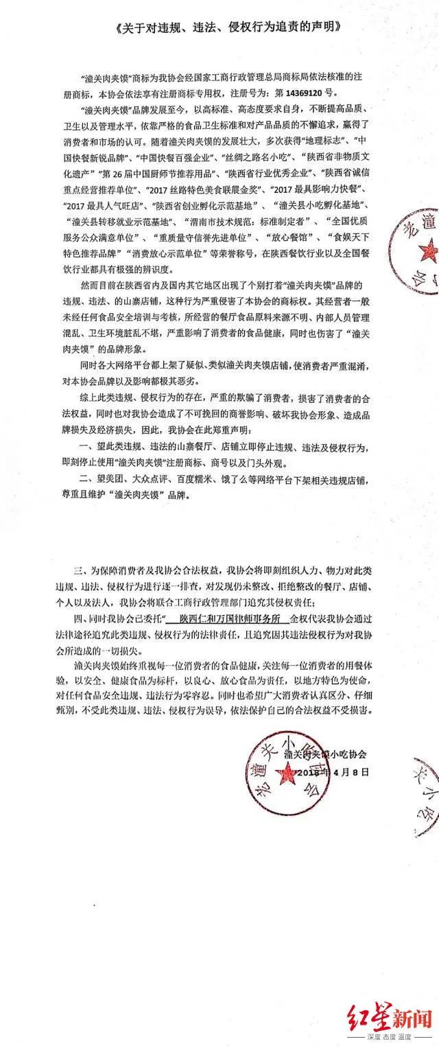 红星新闻记者注意到,一个疑似为该协会此前官网的“老潼关小吃协会”网站(现已无法打开),在2018年时还发布了一份《关于对违规、违法、侵权行为追责的声明》。