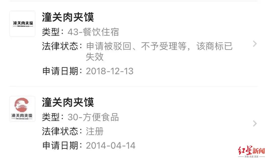 按照商标注册网信息显示,协会通过注册的商标是一个红色的图案,名称为潼关肉夹馍。而另一个申请注册的商标则没有红色图案,但名称仍是潼关肉夹馍。