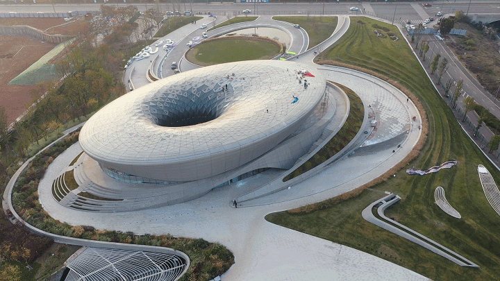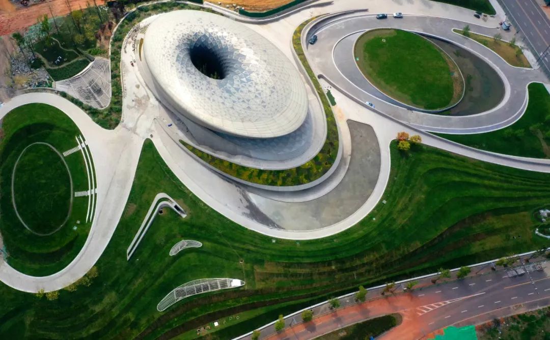 建筑屋顶的中间有一个弧线开口,有着“开眼看世界”的寓意,像是整座建筑的眼睛,又被誉为天府之眼,与项目名称“天府之檐”相得益彰。