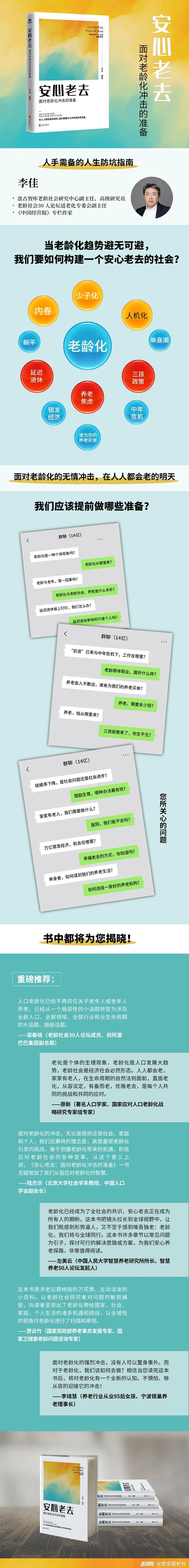然而,面对老龄化的无情冲击,在人人都会老的明天,我们应该提前做哪些准备?盘古智库老龄社会研究中心副主任李佳曾长期从事信息分析的理论研究与工作实践,为此,他有着独特且专业的见解和分析,通过图书《安心老去:面对老龄化冲击的准备》以前瞻性的视角深入浅出解读“人口老龄化”。