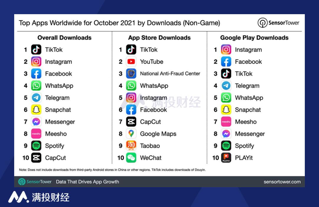 日前,SensorTower在自己的网站上披露了2021年10月全球下载量最高的应用程序,以TikTok为首的社交类软件继续“屠榜”,占据了下载量前十中的大部分名额。TikTok作为中国真正意义上第一个全球化的应用程序,在10月份的下载量超过5700万,中国占据17%的下载量,而美国则达到了11%。