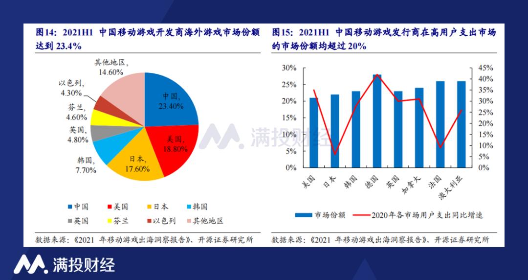 具有规模优势的大厂如腾讯、网易通过搭建本地团队、成立海外子公司或工作室等方式融入本地,扩大在全球游戏发行市场的份额。根据Google和App Annie联合发布的《2021年移动游戏出海洞察报告》,2021年上半年中国移动游戏开发商在海外的市场份额达到23.4%,超越美国和日本,成为全球第一。分市场来看,中国移动游戏发行商在美国、日本、德国、英国、加拿大等高用户支出市场的份额均超过20%