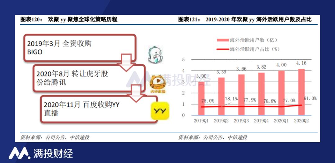早年在国内发展之时,欢聚时代就曾凭借YY在直播市场中有过属于自己的位置。在面对互联网出海大时代时,欢聚时代毅然地放下了国内经营的业务,将重心全部放到了海外市场的运营。2019年,欢聚时代全资收购了海外视频社交平台BIGOLIVE,通过整合两家企业在AI技术上的积累,正式开启了海外业务。随后在2020年,欢聚时代先后将虎牙直播、YY直播转让给了腾讯、百度,完成对国内资产的剥离。