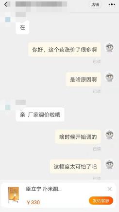接到史女士的反映后,11月24日,华商报查询了“美团买药”、京东健康以及淘宝,都只有一两家店出售扑米酮片,商品名为“臣立宁”,上海新黄河制药有限公司出产,适应症为“用于癫痫强直阵挛性发作(大发作),其药品主要成分就是扑米酮,京东健康上30片1盒最低330元,3盒90片990元,淘宝上也仅一家出售,新包装30片330元,旧包装100片装998元。记者在淘宝上咨询商家,商家表示涨价原因是“厂家调价”。记者又在“美团买药”上搜索,发现了广州一家药店有销售旧包装100片扑米酮片,售价为115元一盒,立即告知史女士,惊喜的史女士赶紧买了两瓶,她说商家货不多,只能买2瓶,但这也暂时解决了自己的燃眉之急,至少还有3个月的药量。该平台上另一商家30片装新包装售价254元。如果按照史女士以前购买的100片装计算,不到100元1瓶的药物,现在市场售价从700多元到900多元都有,涨幅十分惊人。