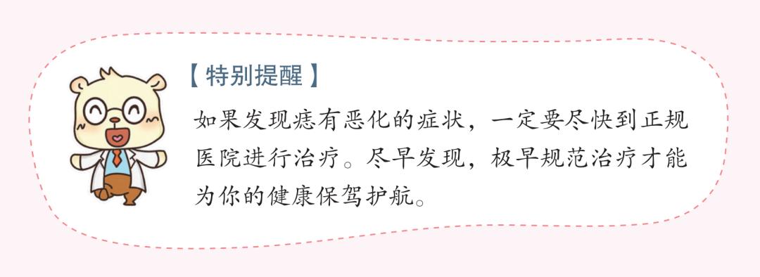 当然恶化成黑色素瘤也是一个长期的过程,那么恶化的征兆有哪些呢?比如前面提到过的痣颜色加深, 表面变得粗糙,迅速增大,局部破溃或出血等等,所以当发生在掌跖、腰周、腋窝、腹股沟等易摩擦部位的交界痣和混合痔出现上述征兆时,应尽早到正规医院行手术治疗或者激光治疗。