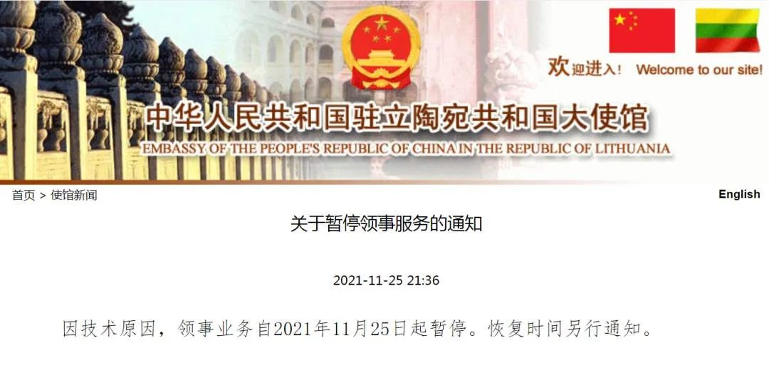2)11月25日,中华人民共和国驻立陶宛共和国大使馆在其官方网站发布关于暂停领事服务的通知。通知称,因技术原因,领事业务自2021年11月25日起暂停。恢复时间另行通知。