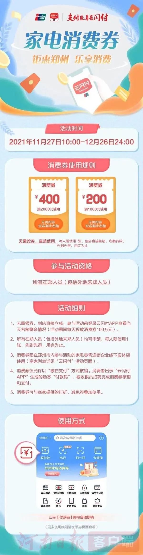 3)郑州人注意,11月27日上午10:00,郑州家电消费券就要和大家见面了!本次消费券发放总额3000万元,为期一个月。家电消费券无须抢券,到店消费直接立减,最高可减400元。消费券使用如有疑问,可与“云闪付”联系(联系电话:95516)。
