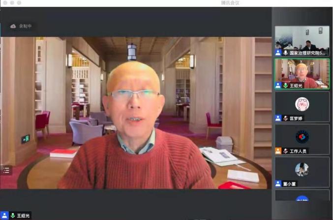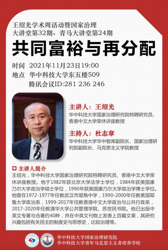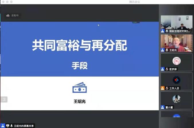 (通讯员:李薇)11月23日晚,由华中科技大学国家治理研究院和华中科技大学青年马克思主义者培养学校共同主办的王绍光学术周活动暨国家治理大讲堂(第32期)、青马大讲堂(第24期)在腾讯会议线上举行,东五楼509会议室线下同步直播。本期讲座邀请华中科技大学国家治理研究院特聘研究员、香港中文大学荣休讲座教授王绍光主讲,主题为“共同富裕与再分配”。华中科技大学国家治理研究院副院长杜志章教授主持此次讲座,国家治理研究院院长欧阳康教授、华中科技大学校团委副书记罗迪、国家治理研究院研究员惠利、国家治理研究院全体博士研究生、青马学员以及全国各地300余人参加此次讲座。