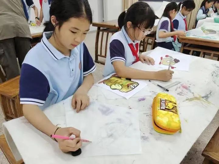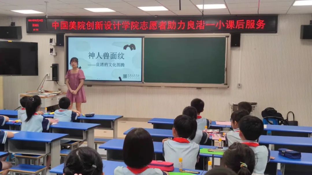 “同学们可以看到,许多良渚文化玉器上都会雕刻这样一种图案,它把首、面、四肢俱全的神人与双目圆睁、口露獠牙的狰狞兽面和谐地结合在一起。这就是神人兽面相,我们今天要设计的底本就是它。”如果没有走进教室,你可能很难想象这堂以中华文明源头——良渚文化为本的设计课会出现在小学生的日常中。来自中国美院创新设计学院的优秀学子,将自己的专业所学倾囊相授于良渚一小的孩子们。而这正是“双减”后杭州市余杭区良渚第一小学(下称良渚一小)积极探索更优质课后托管服务、提升学生综合素养的一个缩影。