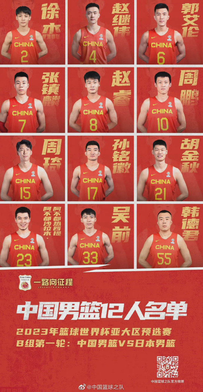 @人民日报体育11月26日消息,北京时间27日上午11:05 ,中国男篮将迎来2023年篮球世界杯亚大区预选赛对阵日本队的比赛。目前,首场比赛的12人名单已经确定。
