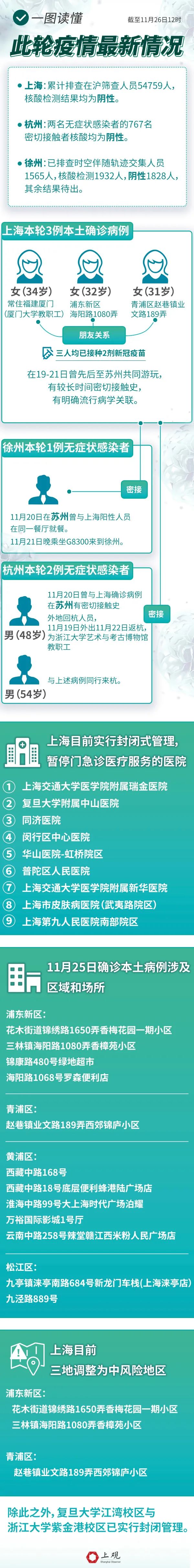 11月25日,上海新增本土确诊病例3例,其中浦东新区2例、青浦区1例;浙江杭州新增本土无症状感染者2例市;江苏徐州新增本土无症状感染者1例。