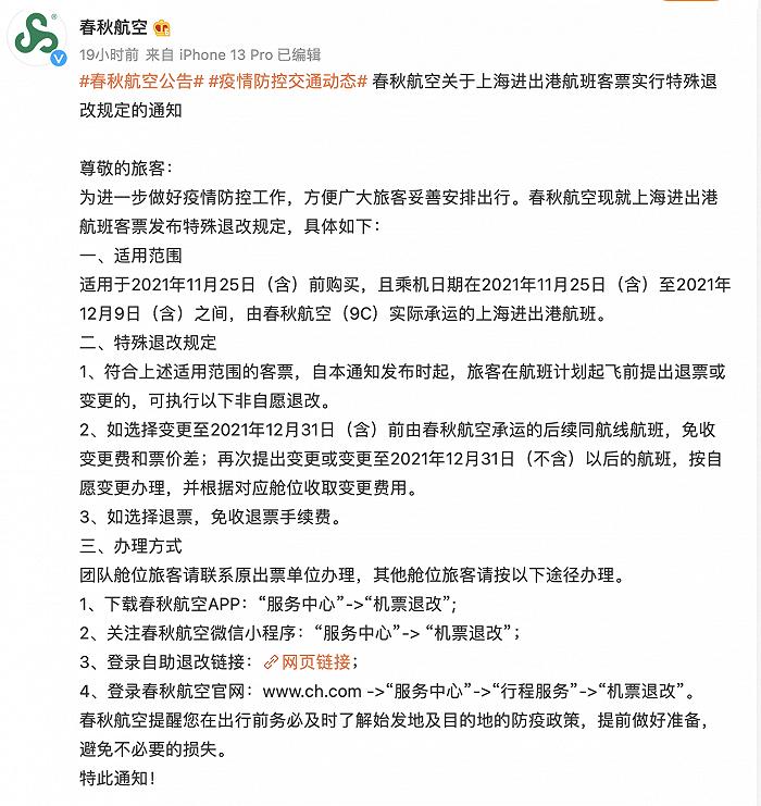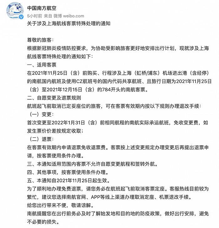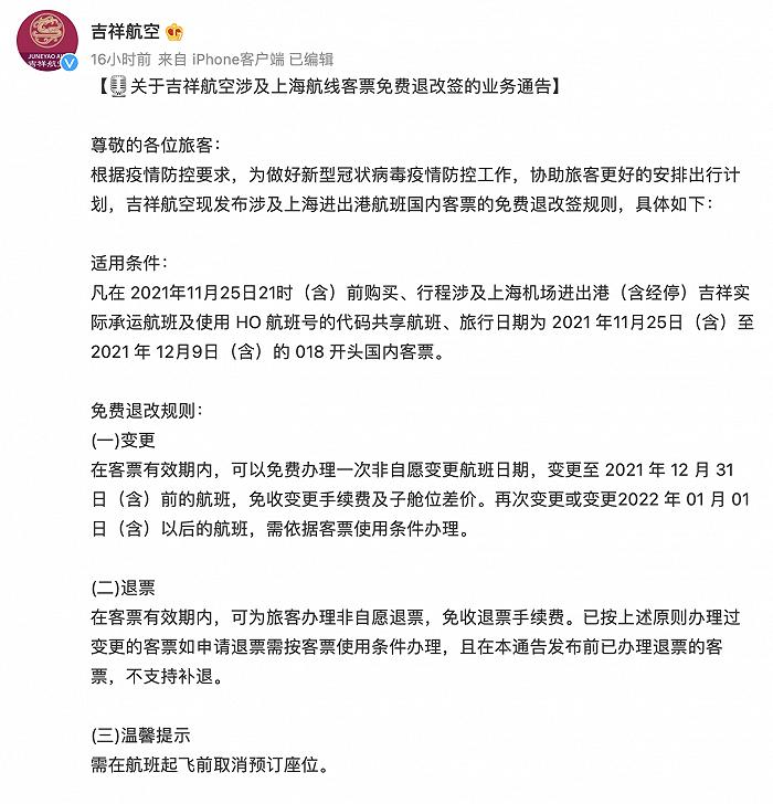 国航、东航、南航、吉祥、春秋、海航、深航、川航都发布了涉及上海、杭州、徐州等航线的免费退改通知。旅客需要注意的是,目前航司政策可免费退改起始时间不相同,旅客退票前需注意自己的机票是否符合政策后再提交。