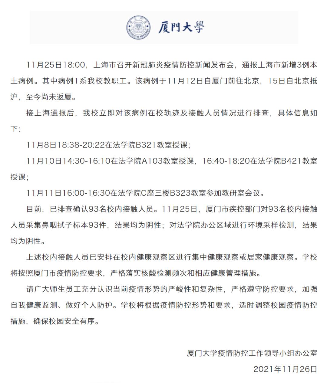 目前,已排查确认93名校内接触人员。11月25日,厦门市疾控部门对93名校内接触人员采集鼻咽拭子标本93件,结果均为阴性;对法学院办公区域进行环境采样检测,结果均为阴性。
