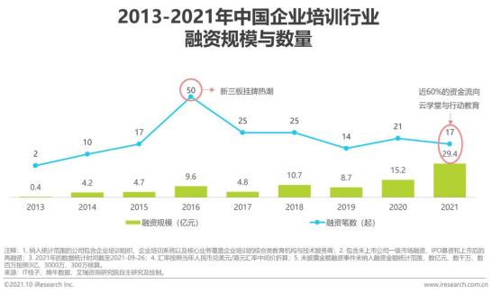 资本:近30亿,融资规模创历史新高,培训系统受资本青睐2010年,联想旗下的君联资本投资了行业老牌企业聚成股份,企业培训赛道开始迎来了资本的关注,作为一个横跨在线教育和企业服务两大热门领域的赛道,融资笔数及规模逐年攀升。2016年, A轮及天使轮初创公司激增,大量标的挂牌新三板,融资笔数创历史新高,开启赛道资本化元年。2020年,疫情背景下,企业在线培训与学习的需求激增,培训系统厂商迎来了一次大规模推广的机会,潜在客群渗透率提升。后疫情时代,细分赛道头部厂商显现,伴随着行动教育登陆A股,云学堂跻身独角兽行列,行业成长逻辑逐渐清晰,资本开始加码,融资规模创历史新高。