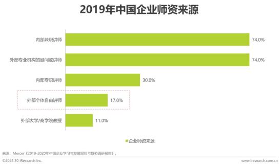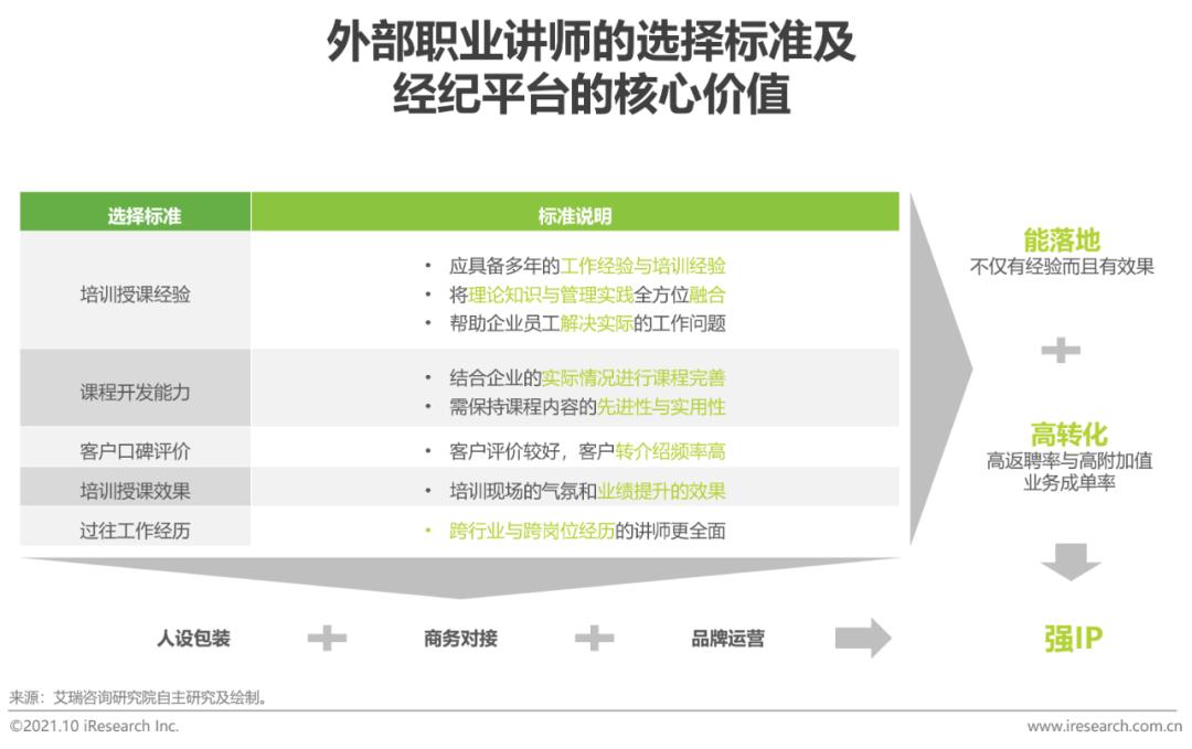 从企业师资来源来看,企业开展培训活动的讲师可分为两种:一种是内部企业培训讲师,通过企业内部挖掘与培养而来,其中内部兼职讲师是我国企业师资队伍的主要组成部分;另一种是外部职业培训讲师,属于企业的培训业务外包。两类讲师各有优劣,企业在开展培训活动的过程中往往会综合考量,通过评估当期培训项目的参训人数、受训对象、课程内容、成本效益等因素,来合理规划内外讲师的授课课时。从企业培训行业来看,外部职业培训讲师属于企业的外部市场,主要包括培训机构讲师、专业院校教师和个人自由讲师,其中不隶属于任何教育与培训组织的个人独立讲师属于行业上游,他们多是一些拥有多年名企工作经验的行业或领域专家,又或者是曾在名校任教多年的专职讲师,但对企业来说,外部个人自由讲师的实际接受程度较低,专业机构在师资挖掘、培养和运作上有更大的竞争优势。在上游师资供给相对充分,师资质量参差不齐的行业特征下,讲师经纪平台应运而生,为个人自由讲师提供人设包装、商务对接和品牌运营等综合服务,为培训机构提供具备强IP、能落地与高转化属性的名师。
