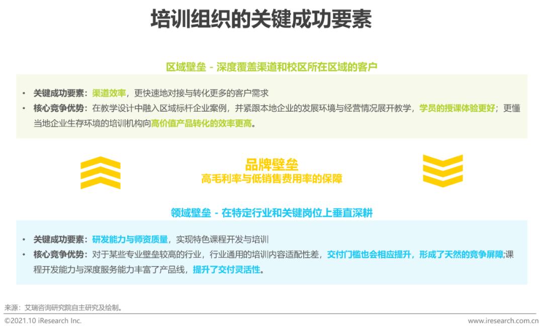 三类培训组织中,社会民办培训机构是主要的组成部分,其市场化程度最高,市场竞争也最为激烈。此外,随着部分高等院校继续教育学院加速推进市场化进程,部分企业大学开始对外输出内部优质的讲师资源与培训服务,都将不同程度地加剧行业竞争。从市场集中度来看,较低的行业进入门槛让行业当中充满了大量小而美的培训组织,以线下面授为主的交付模式又进一步制约了机构规模化扩张的速度,使得市场呈现出高度分散的行业格局。从关键成功要素来看,构建培训组织的区域壁垒与领域壁垒格外重要,这将最终影响企业的品牌质量。