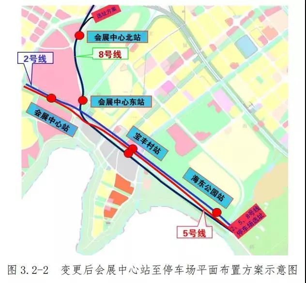 停车场选址调整和增设一座海东公园车站,项目终点由宝丰站延长至新增的海东公园站(渔村停车场),线路增加1.55公里,全长从原来的12.735公里延长至14.285公里。在渔村设置停车场一座,与5号线共址,对8号线停车场用地进行控制预留。渔村停车场同时也是5、8号线的停车场,位于环湖东路与海东路交叉口东北侧渔村地块。