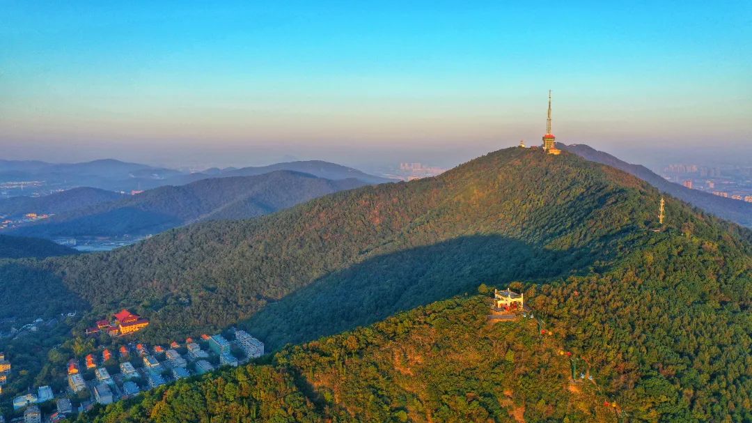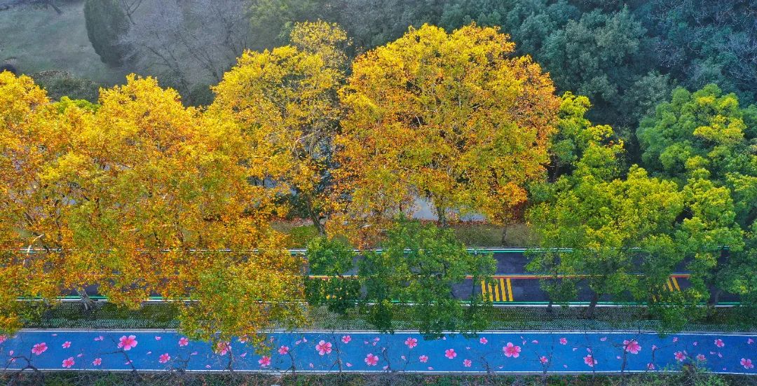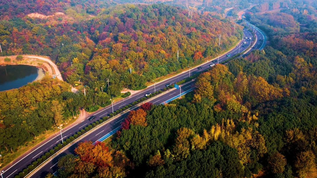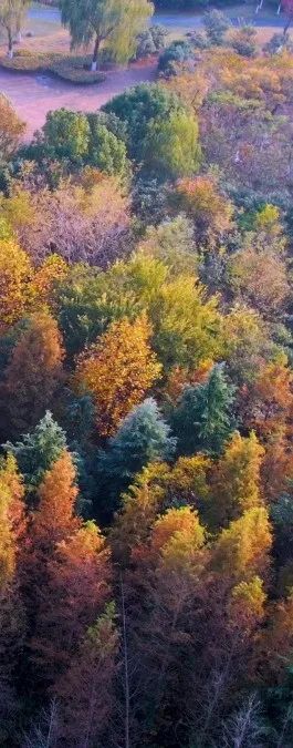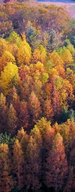 从高空俯瞰而下层林尽染、叠翠流金