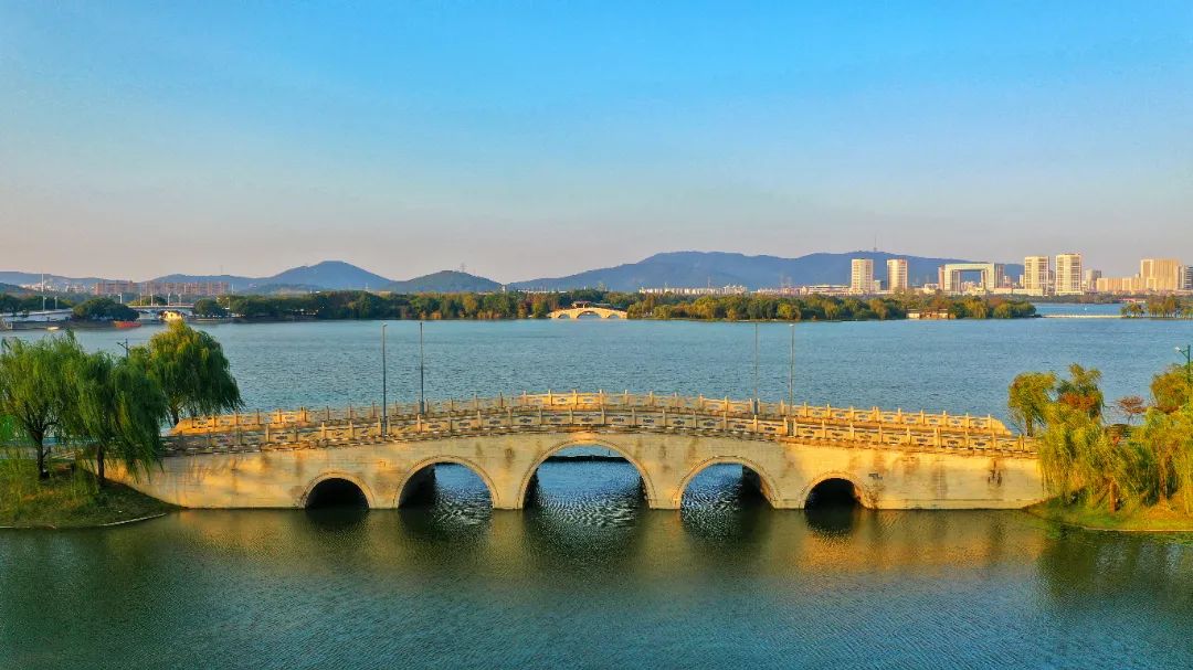 石塘桥横卧在碧波之上凭栏远眺,风景独好