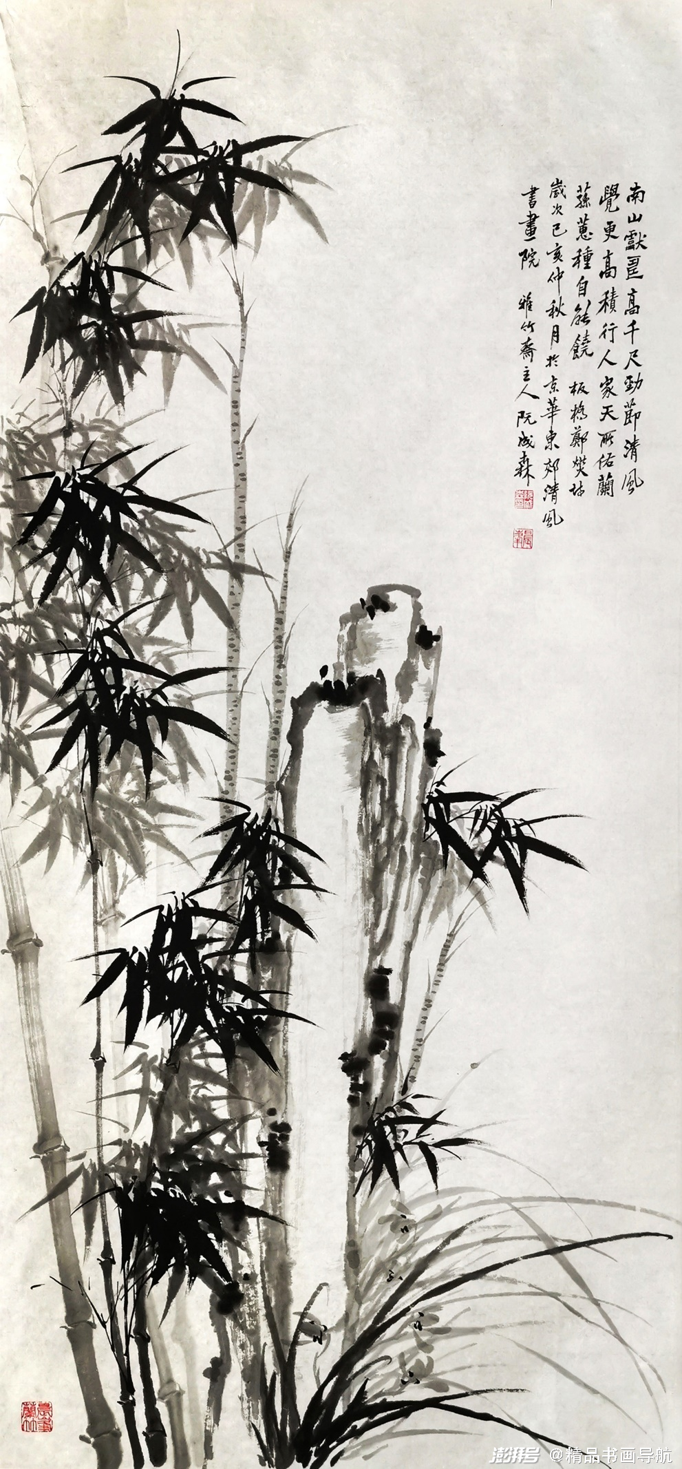 我认识阮成森先生的机缘在北京的东晓景书画创作基地,缘分使然, 我渐渐结识了解了阮成森先生。画如其人,阮成森先生的画作,花鸟人物无不涉猎。他的画细微清新,尤善兰竹。特别画竹,成竹在胸,飘逸洒脱。兰竹配石,典雅妥帖,笔墨精熟。识家一看便知是科班出身而又归野逸,幅幅透着名家风范。阮成森的画有一种中国画的人文精神,我们常说起“文人画”。余则认为文人画即画中有文人情趣,画外有文人思想。文人画不是民间画,不是学院画,似乎有别“画家”的画。文人画往往取材梅兰竹菊,山石小景,讲求笔墨情趣,强调神韵,强调人的修养。阮成森先生的画恰与文人画的规律极为契合,我想这与他的经历学养,孜孜不倦的追求是分不开的。