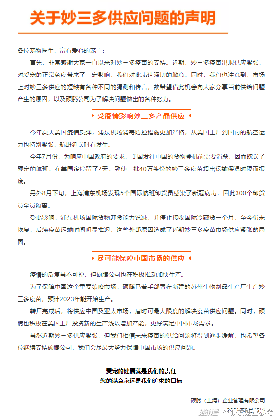 2021年9月,硕腾公司的一份公开声明引发了国内宠物疫苗市场的震荡。公开声明显示: