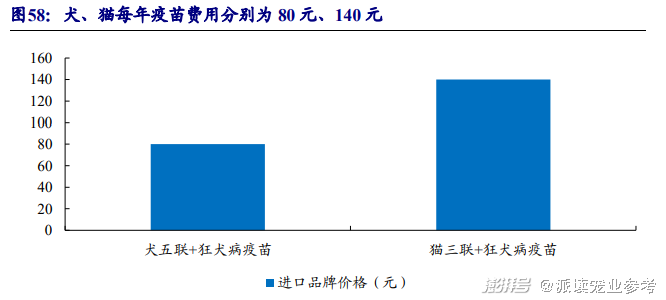 宠物犬每年需注射一针犬五联+狂犬病疫苗,根据进口品牌价格测算新生犬疫苗费用为 240 元,此后每年疫苗费用为 80 元;