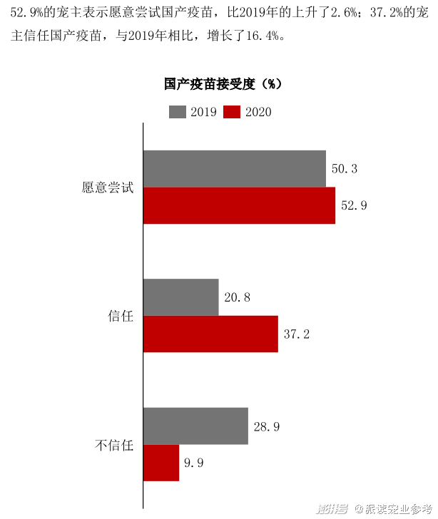 以《2020年中国宠物行业白皮书》中的数据为例,2020年约52.9%的宠主愿意尝试国产疫苗,较2019年上升了2.6%;约37.2%的宠主信任国产疫苗,较2019年上升16.4%。