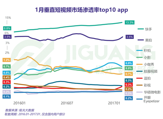 此时入场的抖音似乎有点晚了,毕竟在2016年的短视频市场上,快手、美拍、秒拍、小咖秀、最右等短视频直播APP,都有着不俗的表现。尤其是快手,据极光大数据显示,从2016年1月至2017年1月,其在短视频市场上的市场渗透率一马当先,甚至远远大于其他所有同类APP渗透率的总和。