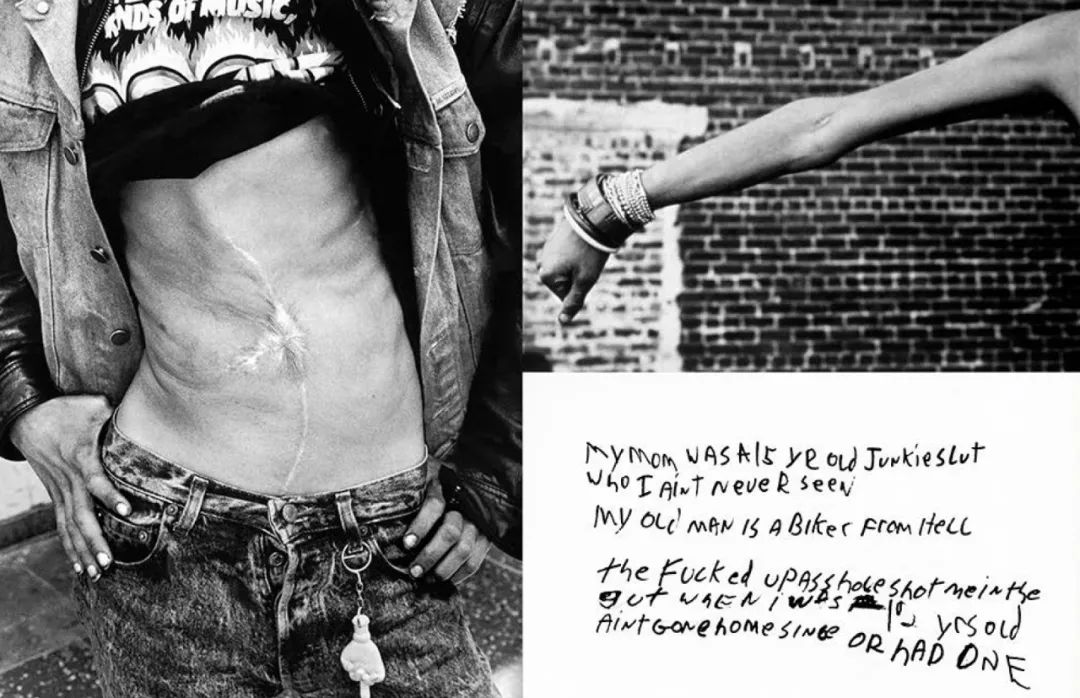 「Raised by Wolves」Jim GoldbergJim Goldberg在洛杉矶和旧金山的街头辗转拍摄了近十年,记录下了城市中无所依归的孩子,他们被赶出或是跑出受虐的家庭,来到街头,面对城市错综复杂的阴暗沟壑,在那里,孩子们教孩子如何生存。这十年中,Jim在街头结识了许多流浪的孩子们。与他们朝夕相处的过程里,Jim热切地用镜头记录下了这些离开家庭的孩子们的个人故事,最终凝结而成了一本“完全真实的虚构作品”《Raised by Wolves》,一本由摄影、文字、影像、物件等等记忆集锦而成的书。