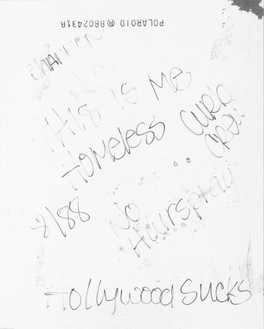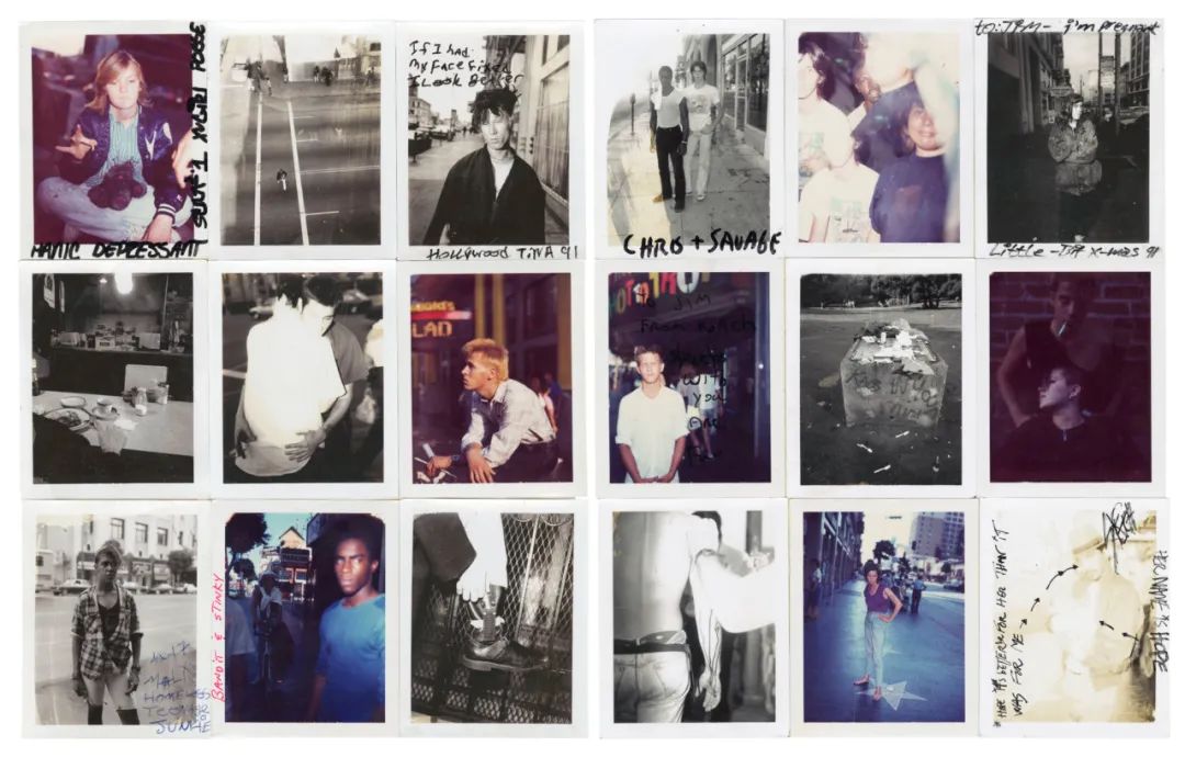 14岁的女孩从佛罗里达州出走,偷了她爸爸的信用卡的女孩,正怀着三胞胎美国加利福尼亚州好莱坞 1991 「Raised by Wolves」Jim Goldberg在这本书的末尾Jim列出了满满六页的宝丽来照片,它们大多是Jim在街头赠予孩子们的礼物,许多照片上都写下了文字,读起来就像是街头的纪念册。之后,这些宝丽来的照片也变成了Jim Goldberg在构思《Raised by Wolves》时的人物草稿。