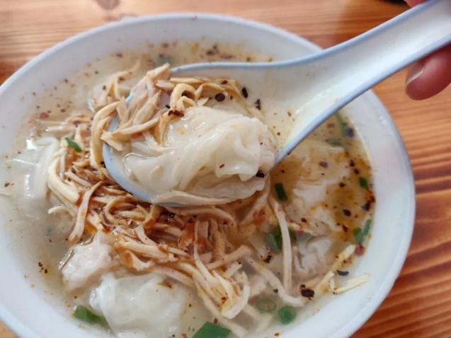 现包的小馄饨,用竹签粘上一星肉馅卷出来的那种,一分钟能包上20几只。小馄饨皮子属于爽滑又筋道的,皮滑肉鲜,超满足!