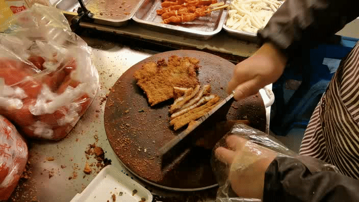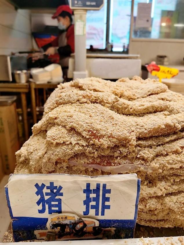 在盛岸市场开了二十年的小店,生意火得不得了,窗口排队的人不停,里面放满了各种炸物,炸猪排不愧是头牌,裹好饼干糠的猪排层层叠叠,堆得老老高。