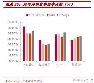 从研发来看,公司核心团队起源于中科院微系统所,是国内率先研究4G关键技术的企业之一。2021年上半年,公司在研发方面投入0.74亿元,同比增长至22.15%,占总营收比例的43.49%。2017-2020年,公司研发支出分别占据总营收的25.19%、24.96%和29.77%,均维持在25%左右,在同行业可比公司内处于领先水平。