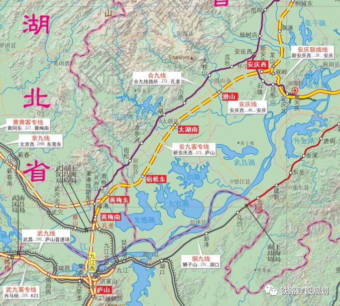 全长171公里,时速350公里,设安庆西、潜山、太湖南、宿松东、黄梅东、黄梅南(越行站,属南局)、九江等7站,以黄梅南站为界,分属上海、南昌局。
