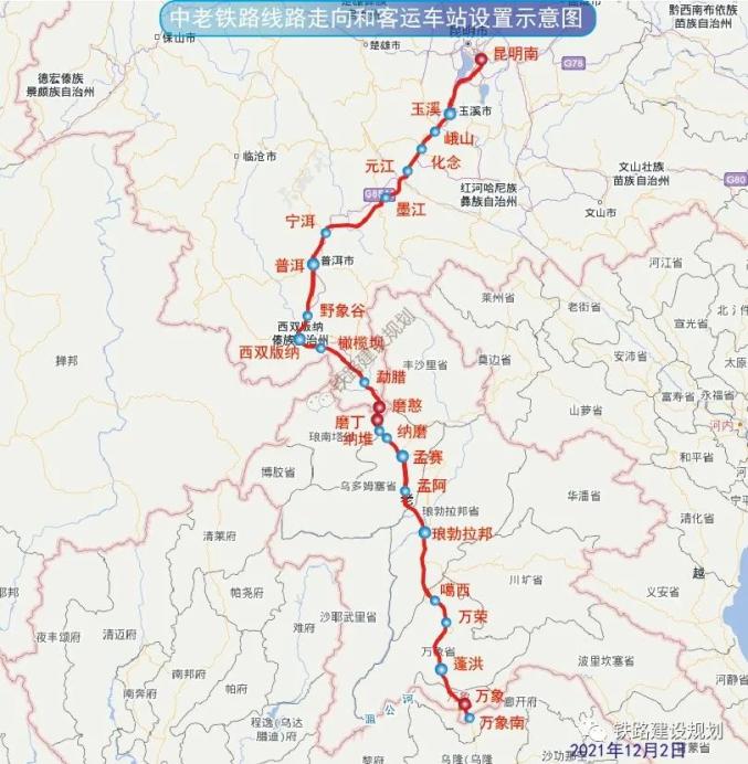 最新进展情况:11月29日,国内段按照一天15趟动车组完成满图运行试验。玉磨铁路线路走向和设站示意图▼