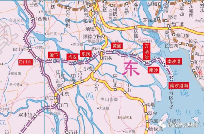 全长88公里,为国铁一级双线电气化铁路,时速120公里。设南沙、黄圃(兼货运)、东凤、均安、棠下、江门北等6个客运站,万顷沙、南沙港、南沙港南3个货运站。最新进展情况:11月29日正线铺轨完成,计划年底先行开通货运,2022年开通客运。