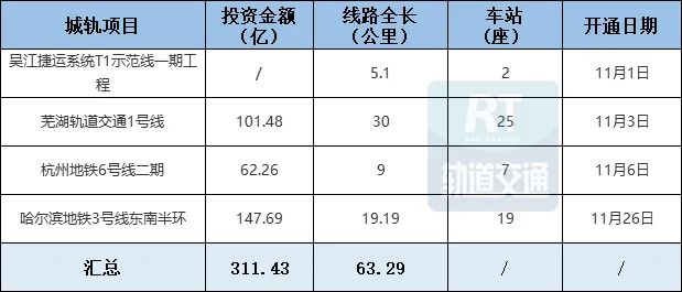 11月份新增运营项目约4项,总投资金额311.43亿元,线路全长63.29公里。10月份铁路项目暂时没有开通。新增开工