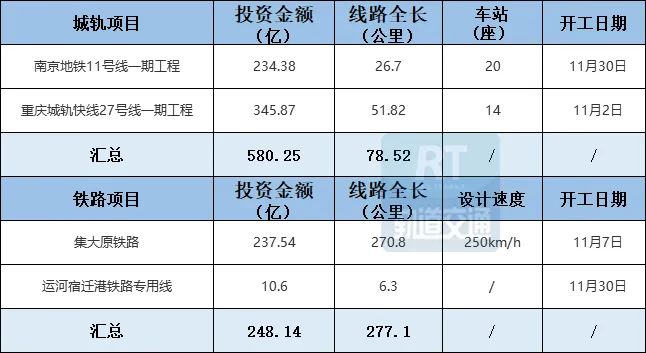 11月份新增开工4项:包含城轨项目2项,总投资额580.25亿,线路全长78.52公里;铁路2项,总投资额248.14亿,线路全长277.1公里。新增批复