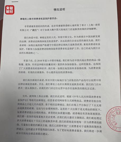 一、上海市消保委昨天希望就退换货政策能够做一个详细的解释,但此份说明通篇没有详细解释的具体内容。上海市消保委副秘书长唐健盛认为,对于消费者来说,在加拿大鹅购买了一件衣服,什么情况下,可以要求退换货?具体流程是什么?如果退换货当中发生了问题,那么消费者还可以怎样向公司进行沟通?希望公司能够就相关的退换货条款,做出一个详细的解释和说明。