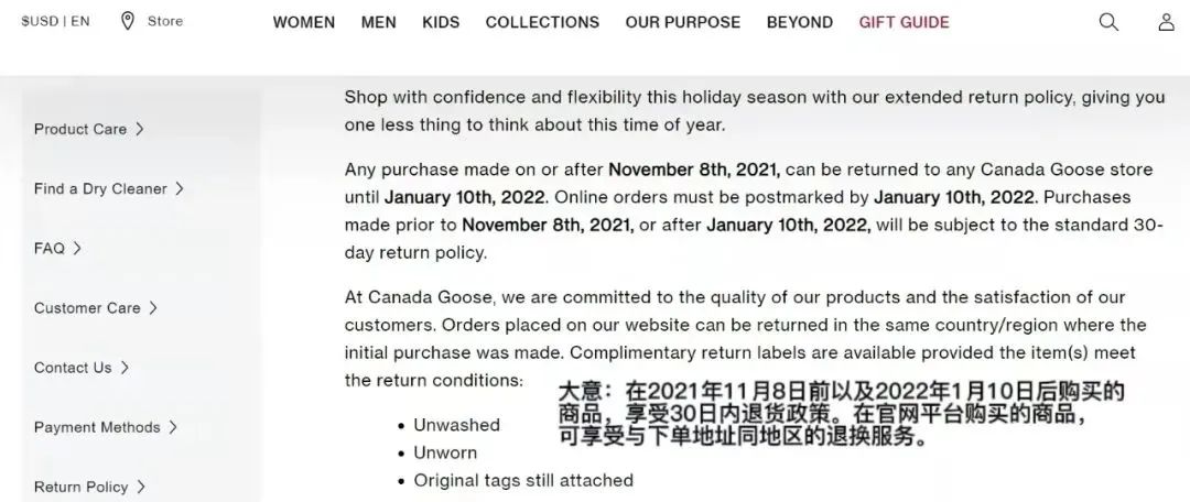加拿大官网显示,由于圣诞假期,在美国、加拿大、英国地区于2021年11月8日或之后购买的任何商品,均可在2022年1月10日前退回至任何加拿大鹅店铺。这表明,近期其顾客享受多达33天的退货政策。