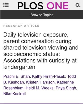 [3].Shah PE, Hirsh-Pasek K, Kashdan TB, et al. (2021) Daily television exposure, parent conversation during shared television viewing and socioeconomic status: Associations with curiosity at kindergarten. PLoS ONE 16(10): e0258572.
