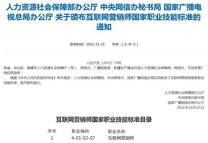 近日,人社部、中央网信办、国家广播电视总局共同发布了互联网营销师国家职业技能标准。