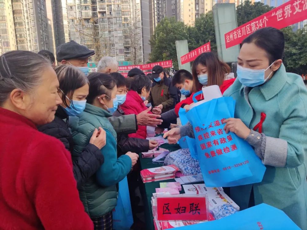 达川区妇联会同30余个区级部门在天益广场开展了禁毒防艾广场宣传活动,发放《珍惜生命 预防艾滋》《生命至上 终结艾滋 健康平等》等宣传手册2000余份、避孕套2000余只,围裙200余根,环保购物袋300余个,日历100余份。AIDS DAY