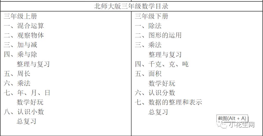 北师大三年级数学教程目录,把所有三年级对应的知识点展示了出来。