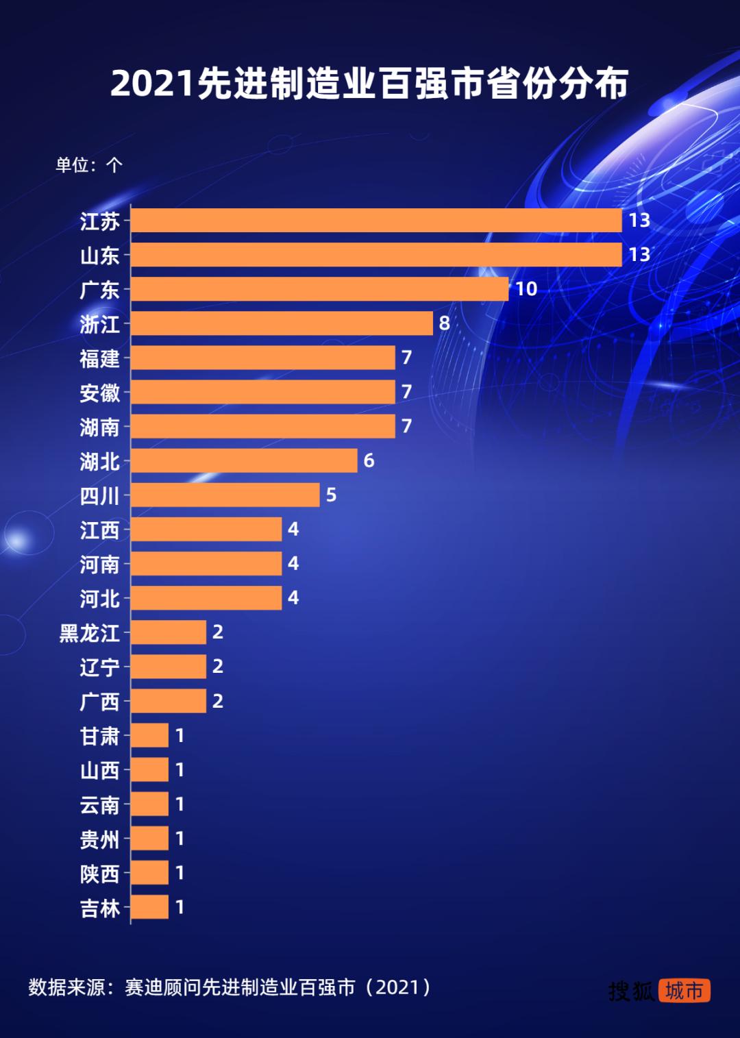 2021年先进制造业百强城市中,江苏、山东上榜城市最多,均为13个,江苏是唯一一个全省上榜的省份。广东10座城市上榜,数量仅次于江苏和山东。粤苏鲁三大经济强省,包揽了超过1/3的先进制造业百强市。