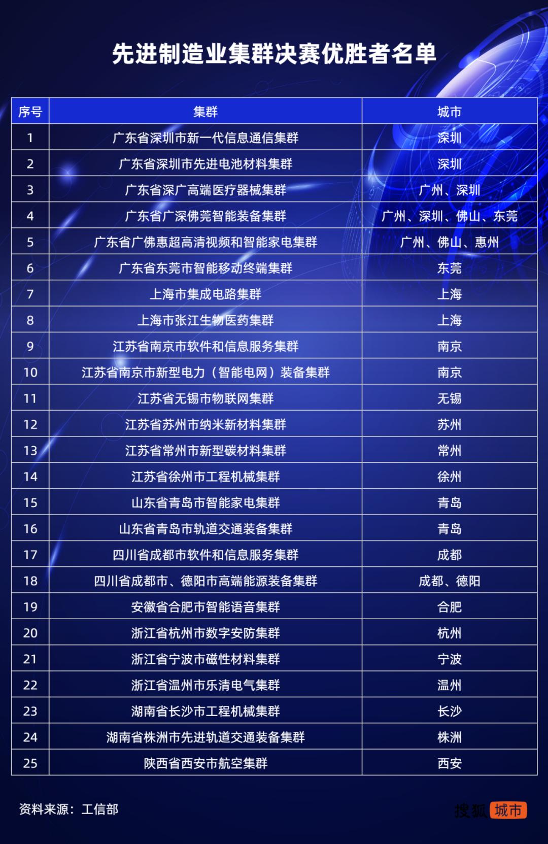 此外,先进制造业决赛优胜集群所在城市优势突出。今年上半年,工信部围绕新一代信息技术、高端装备、新材料、生物医药等重点领域,遴选25个先进制造业集群作为重点培育对象。