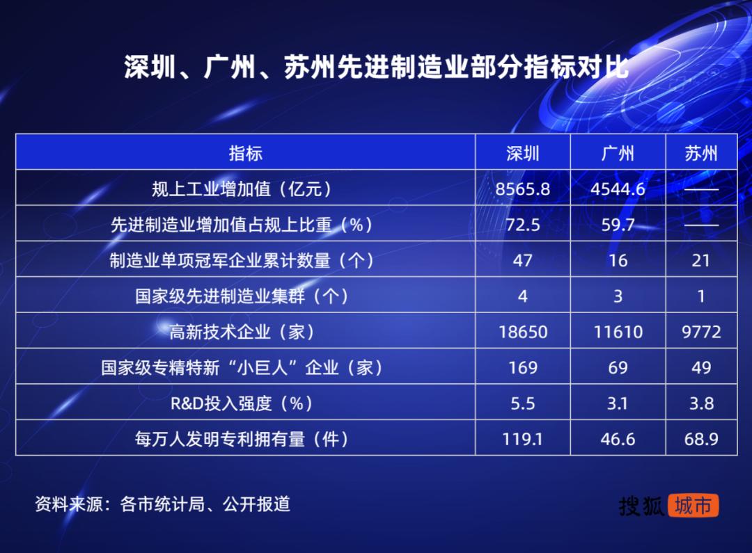 深圳、广州和苏州继续稳居前三。深圳堪称制造业高质量发展的城市样本,先进制造业是工业经济的主体,2020年增加值占规上工业的比重高达72.5%。25个国家先进制造业集群深圳独占4个,位居全国城市之首。
