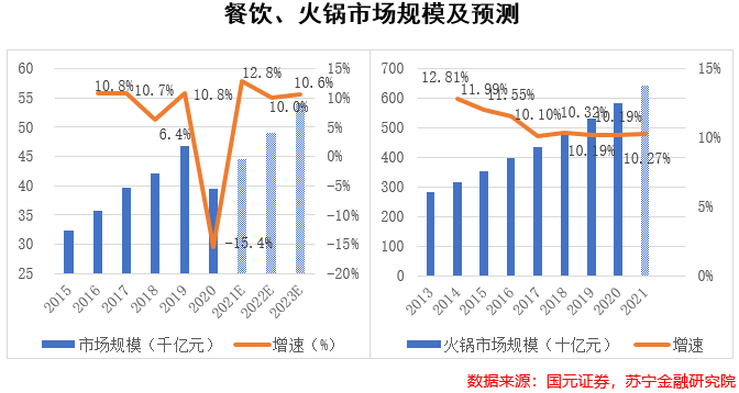 虽然近年来消费的增速逐渐,但餐饮是少数仍保持高增速的行业。如果剔除2020年疫情的冲击,餐饮行业的增速要远高于社会消费品零售总额的增速。火锅行业的表现更为亮眼,疫情冲击之下,仍然保持了10%以上的增长。