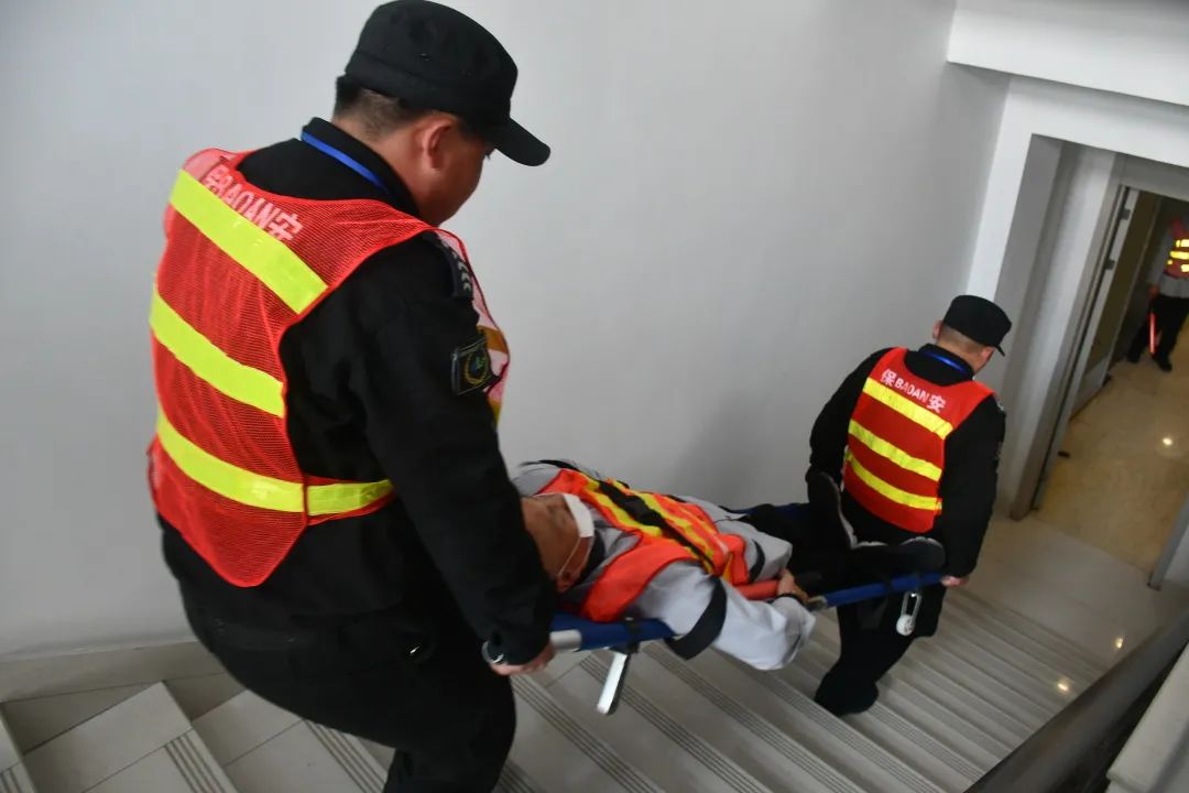 集团总部二楼会议室“突发”火灾事故,随着警铃响起,全体工作人员进行消防演练,迅速疏散并开展火灾自救行动,在指挥员的引导下楼内所有人员快速疏散至集结点,抢救被困伤员,整个过程急而不乱、稳定有序。